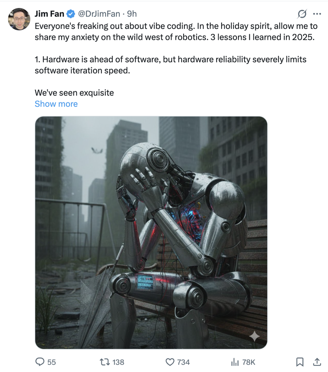 所有人都在为vibe coding感到兴奋。在节日气氛中,请允许我分享一下我对“机器人领域狂野西部”的焦虑——这是我在2025年学到的3个教训。