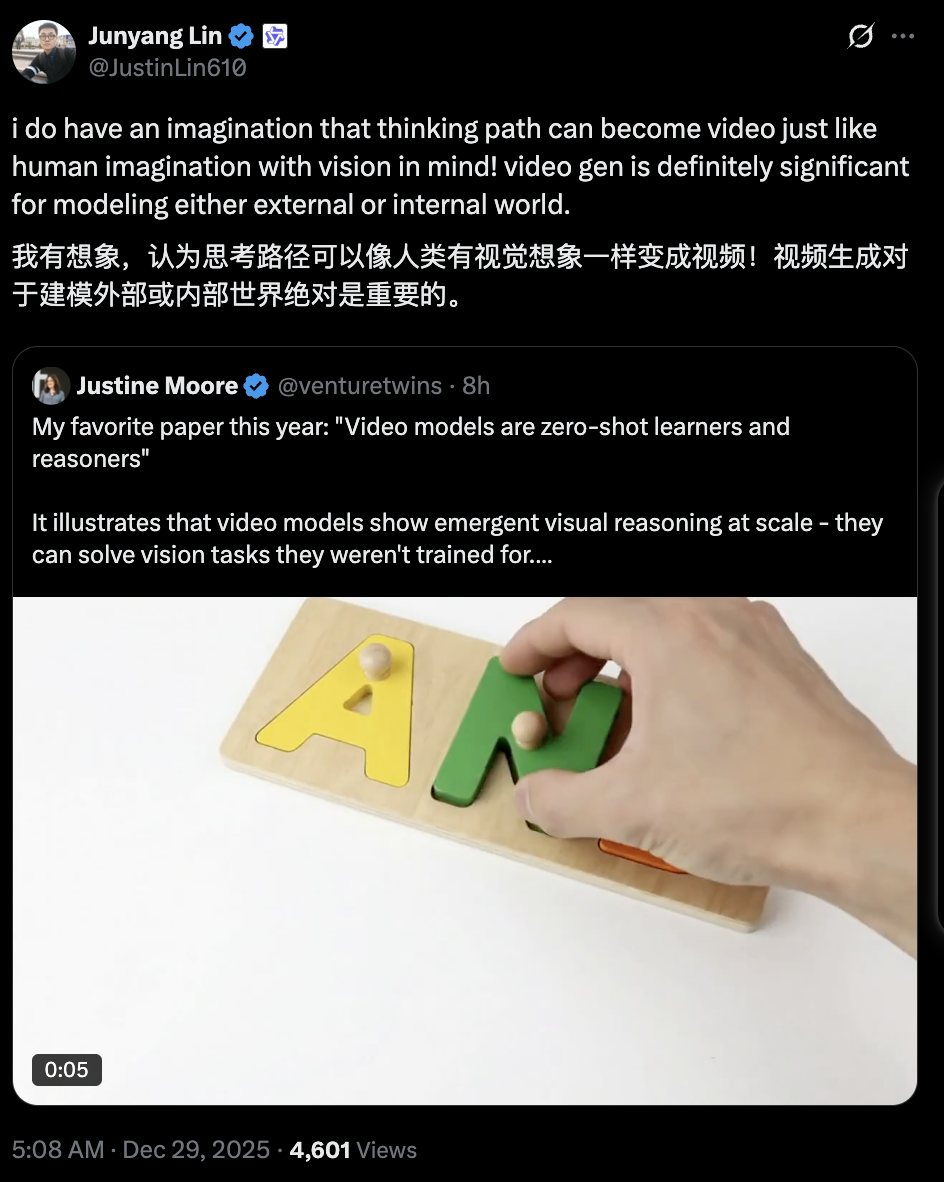 比如,阿里最年轻P10、Qwen大模型技术负责人林俊旸最新转发了一篇名为《Video models are zero-shot learners and reasoners》的研究。