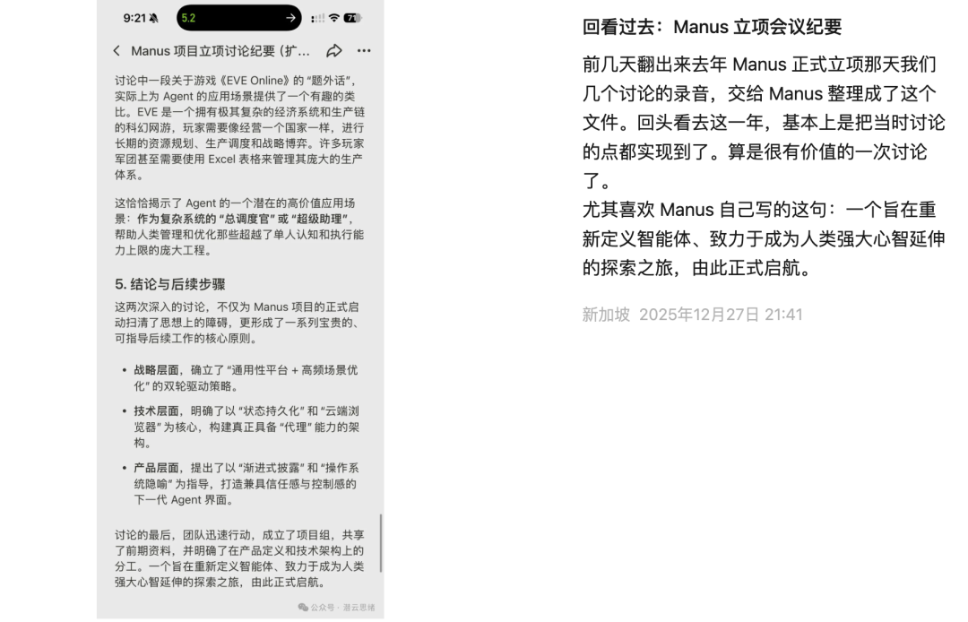 就在此次收购前夕,Manus官方发布的一篇公众号文章《回看过去:Manus 立项会议纪要》在朋友圈小规模刷屏。