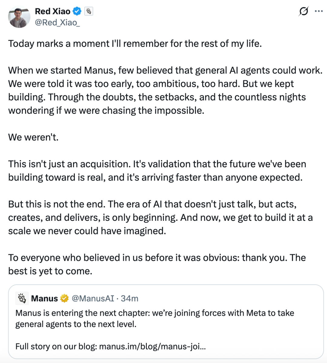 不知道等团队开始一起工作过后,两人将是什么样的汇报线关系。收购完成后,Manus创始人肖弘将出任Meta副总裁。