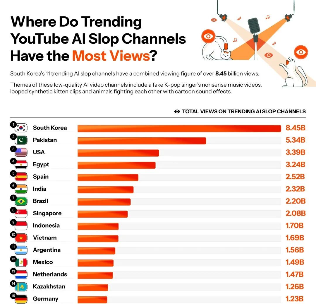 虽然西班牙的频道订阅人数最多,但韩国上榜的11个热门AI垃圾频道却狂揽了84.5亿次总观看量。