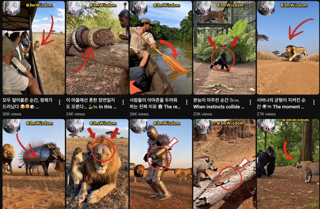 作为全球社交媒体和智能手机使用率最高的国家之一,韩国头部相关频道的总观看量约为84.5亿次。其中,Three Minutes Wisdom这个频道尤为突出。它主要发布高度拟真的画面:野生动物被可爱的家养宠物击败,仅该频道就累计获得了20.2亿次观看。