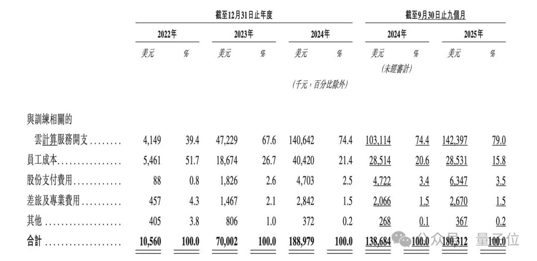2022年、2023年、2024年及2025年前九个月,训练成本分别为415万美元、4723万美元、1.4亿美元和1.42亿美元。整体呈现持续攀升。