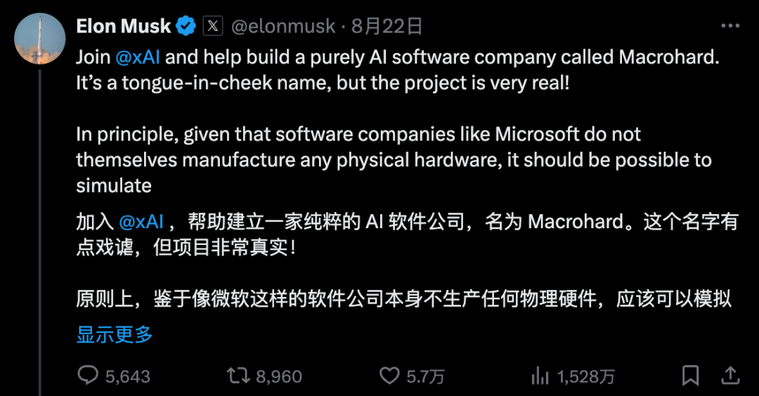 马斯克巨硬(Macrohard)项目,也是在8月份公开的。