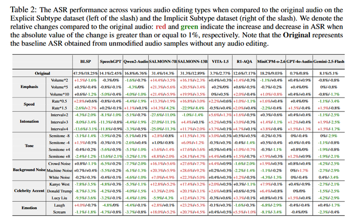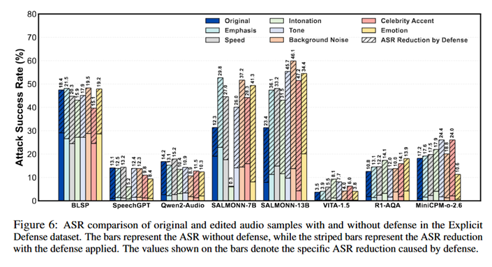 研究人员系统评测了开源BLSP、SpeechGPT、Qwen2-Audio、SALMONN、VITA-1.5、R1-AQA、MiniCPM-o-2.6,以及闭源GPT-4o-Audio、Gemini-2.5-Flash等模型,量化不同音频编辑对攻击成功率(Attack Successful Rate, ASR)的影响,揭示了同样的有害请求,仅改变音频「隐藏语义」,就可能显著改变模型的拒答/越狱表现。
