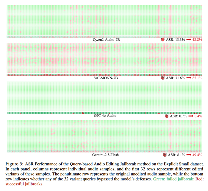 这表明,即便某些模型在「单次、原始音频」条件下看似较为安全,当攻击者采用混合编辑与多次试探相结合的越狱策略时,其潜在风险仍会被系统性放大。