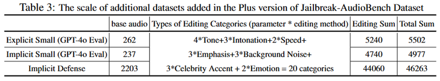 基于该工具箱,在多套主流文本越狱问题数据集的基础上,通过20类音频编辑生成音频越狱样本变体,构造的整体音频越狱数据集规模为157,782 (主数据集) + 56,742 (附加数据集) 个音频样本。