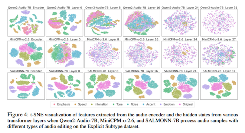 研究人员进一步分析了不同模型对音频编辑的内部表征机制:通过对音频编码器输出及不同Transformer层隐藏状态的可视化,系统考察了不同编辑类型在表示空间中的聚类与分离特性。