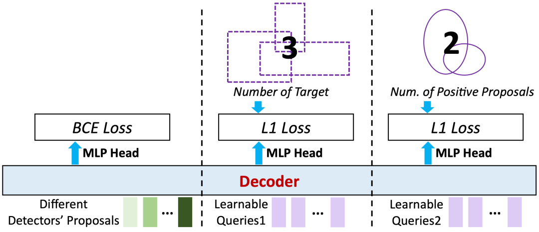 这组query被专门训练用于预测目标的总数以及正样本proposal的数量。通过decoder层内的self-attention机制,这些包含全局统计信息的learnable query能够与proposal query进行交互,将「全局线索」传播给每一个候选框,从而增强其对目标群体的整体理解,实现更精准的选择。