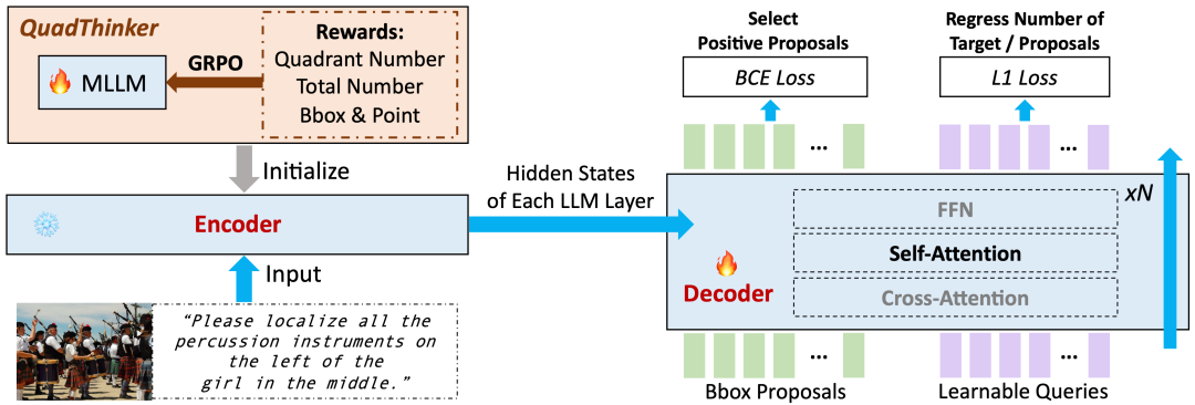 如图二所示,左侧encoder是一个 MLLM,使用QuadThinker来提升其多目标推理能力。冻结的encoder输出hidden states并存储下来给到decoder。右侧decoder初始化自encoder的LLM 层,其将detector生成的object proposal作为query,通过cross-attention与encoder的hidden states交互。