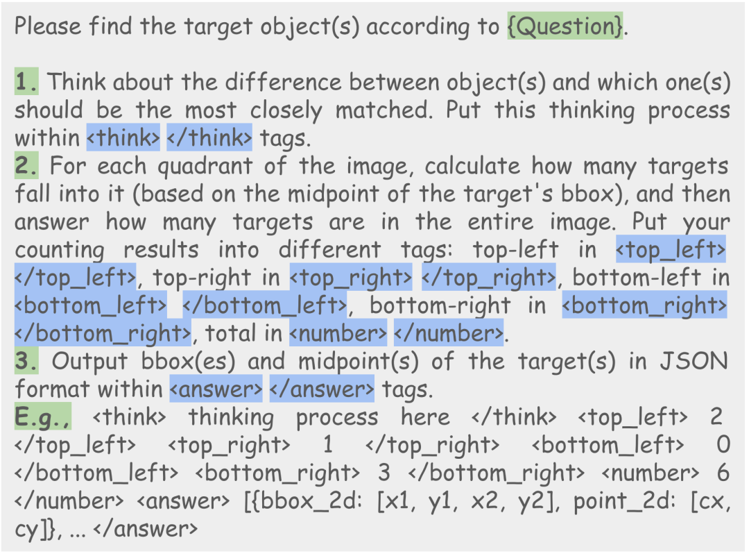 针对MLLM在多目标场景下推理能力下降的问题,研究人员提出了一种基于 GRPO 的强化学习训练范式QuadThinker,通过设计特定的prompt和reward functions,引导模型执行区域到全局、分步推理的过程:先分别统计图像四个象限内的目标数量,再汇总总数,最后预测具体坐标。