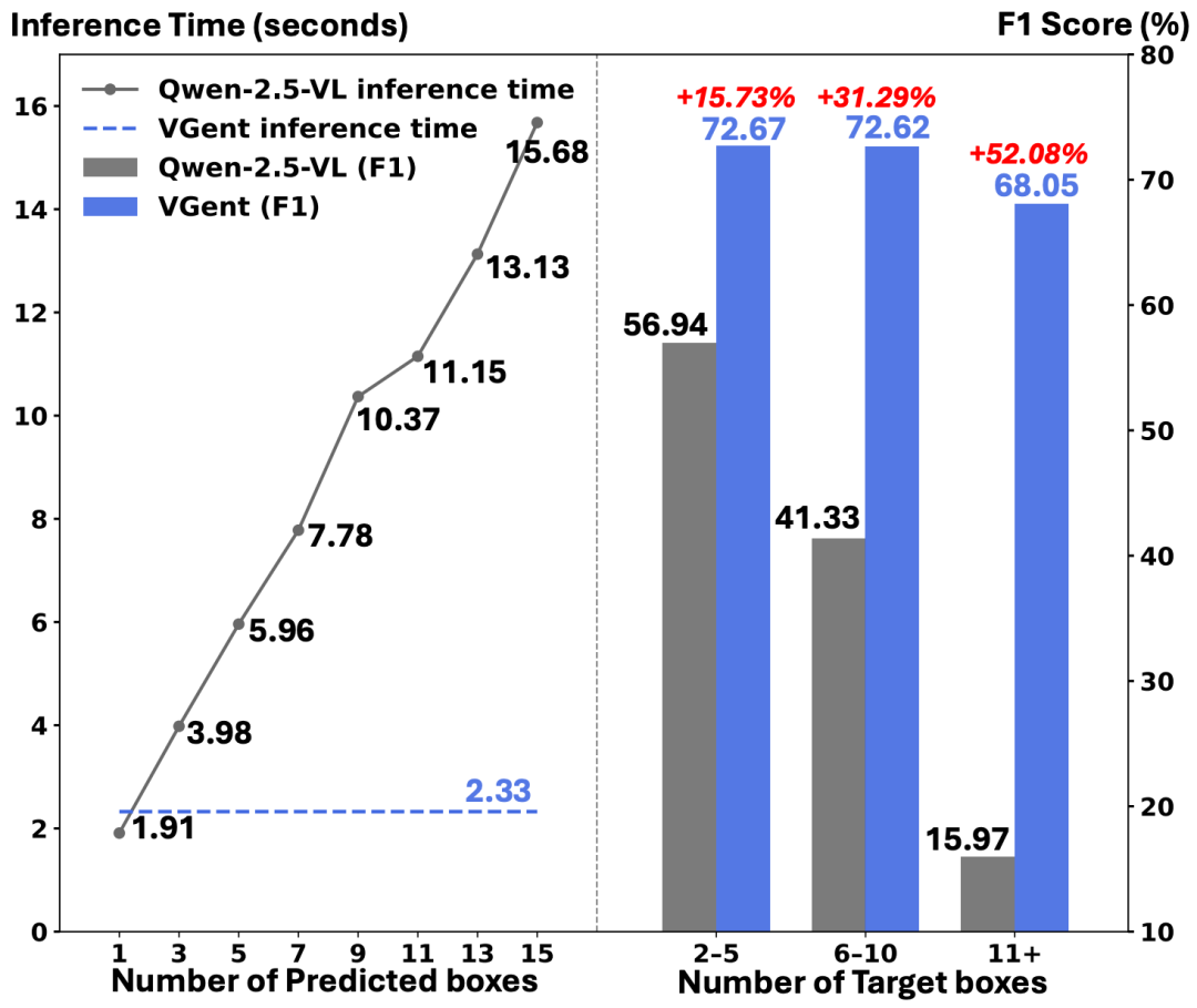 图一:VGent(蓝色)与现有先进的MLLM(Qwen2.5-VL,灰色)在多目标视觉定位任务上的对比。左图显示VGent的推理时间恒定且迅速,而 MLLM 随目标数量增加呈线性增长;右图显示VGent在F1分数上实现了显著提升,特别是在多目标场景下。