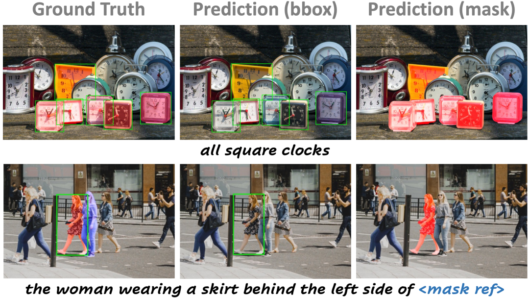 因为IoA的分母是候选mask自身面积,该机制能精准召回那些虽然只覆盖了部分目标群(如细小的挂绳)但依然有效的 proposal。模型使用另一个独立的MLP head专门预测这种分割导向的标签,用于解决视觉定位中分割类型的输出。