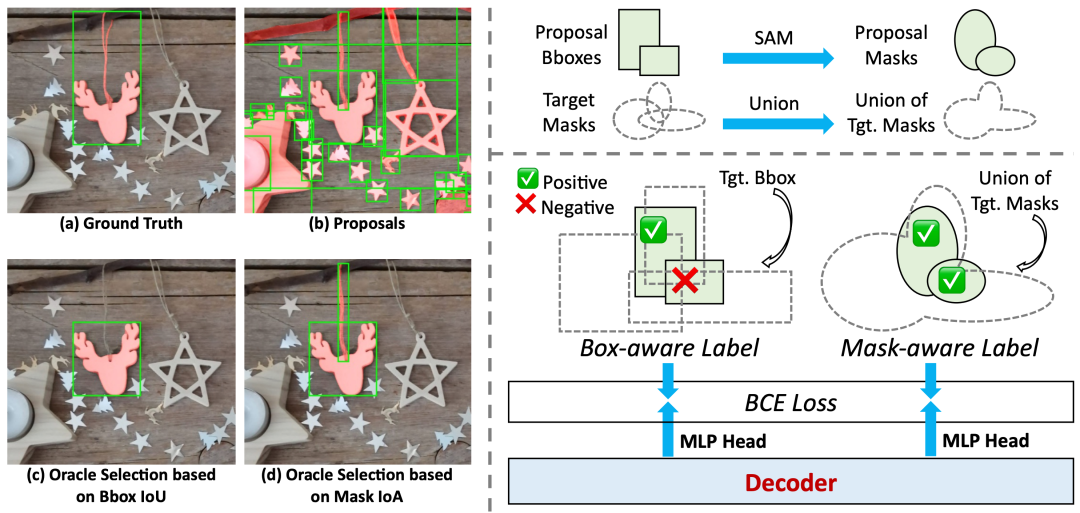 为此,VGent引入了Mask-aware Label,使用IoA (Intersection-over-Area) 指标进行额外的标签分配。如图四(右),IoA通过计算候选mask (通过proposal prompt SAM得到)与多目标真值的union mask的交集,并除以候选mask自身的面积得到。