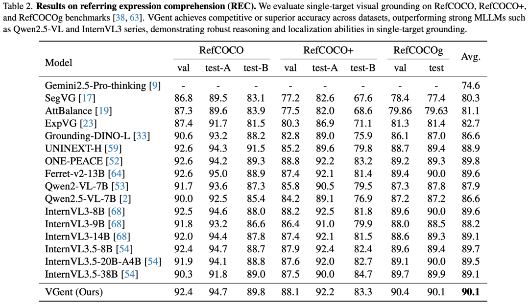 VGent实现了90.1%的平均准确率,超越了InternVL3.5-20B和38B等更大规模的模型 。相比其backbone (Qwen2.5-VL-7B),VGent带来了+3.5%的平均性能提升。