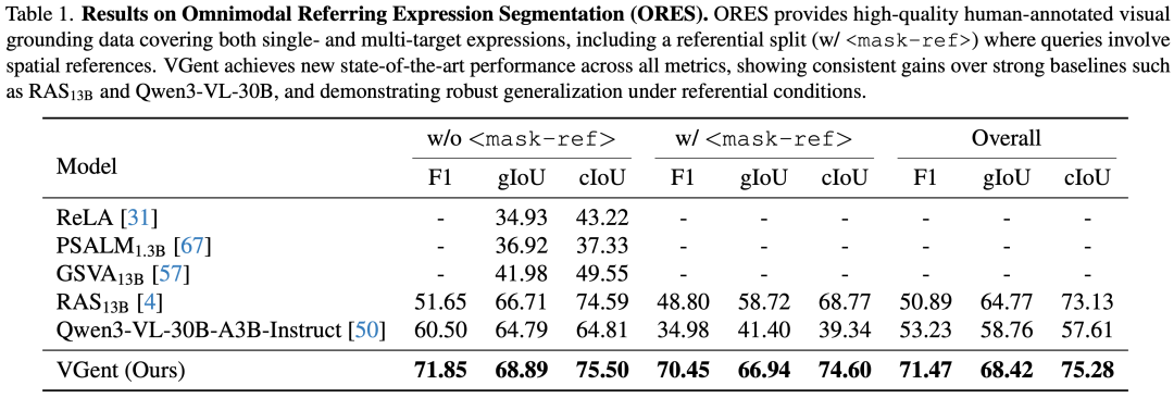 如图六所示,在极具挑战的ORES基准上,VGent 取得了全新的SOTA成绩。相比之前的最佳方法RAS13B,VGent在F1分数上实现了+20.58%的巨大提升。VGent在gIoU和cIoU上都带来了明显的提升。