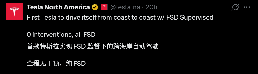 刚刚,特斯拉FSD,完成全球首个完全自动驾驶的横穿美国。