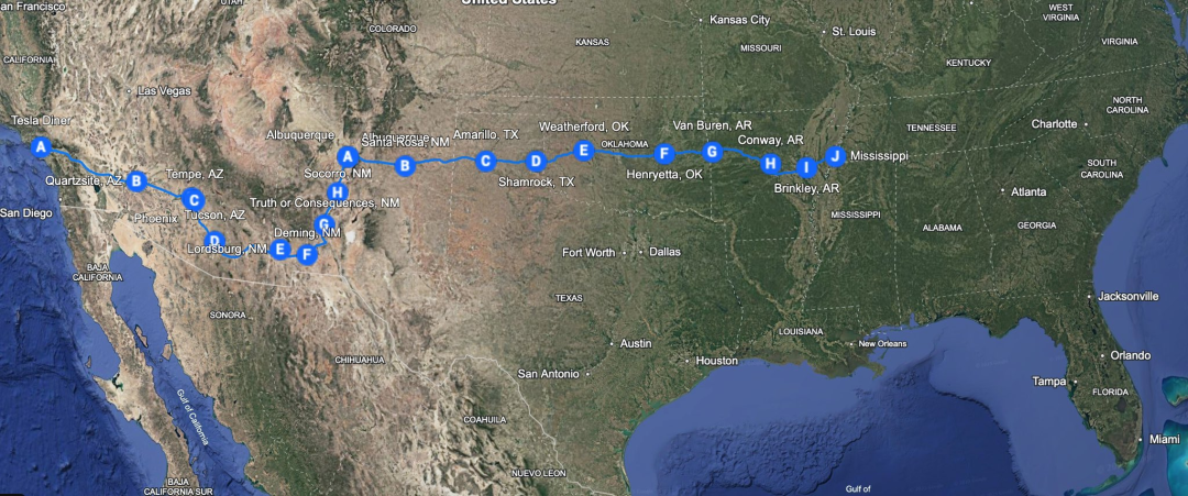 他从洛杉矶的特斯拉餐厅出发,最终到达南卡罗来纳州默特尔海滩,穿越了24个州。