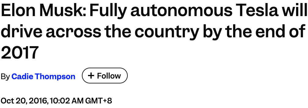 彼时,马斯克意气风发,豪言:「到2017年底,特斯拉将能够从洛杉矶自动驾驶到纽约,全程哪怕你碰一下方向盘都算我输。」
