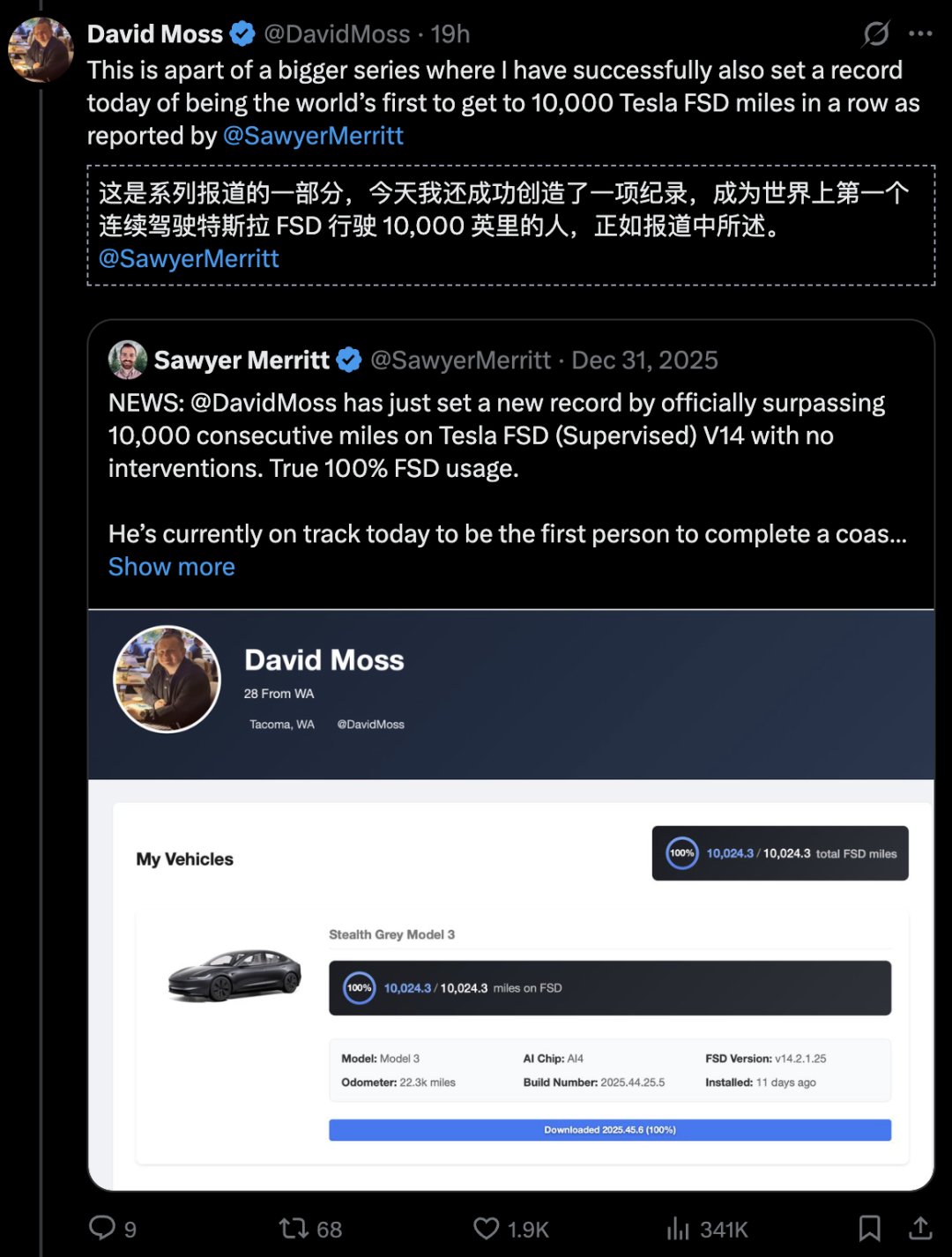 然而David Moss晒出的仪表盘显示,FSD V14千真万确完成了100%的完全自动驾驶。