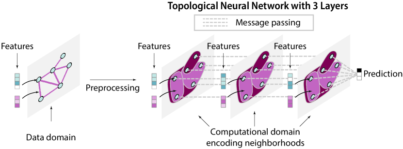 图 1 拓扑神经网路(详情请见集智俱乐部公众号文章《拓扑深度学习捕捉数据的高阶关系:信息传递拓扑神经网络概述》)