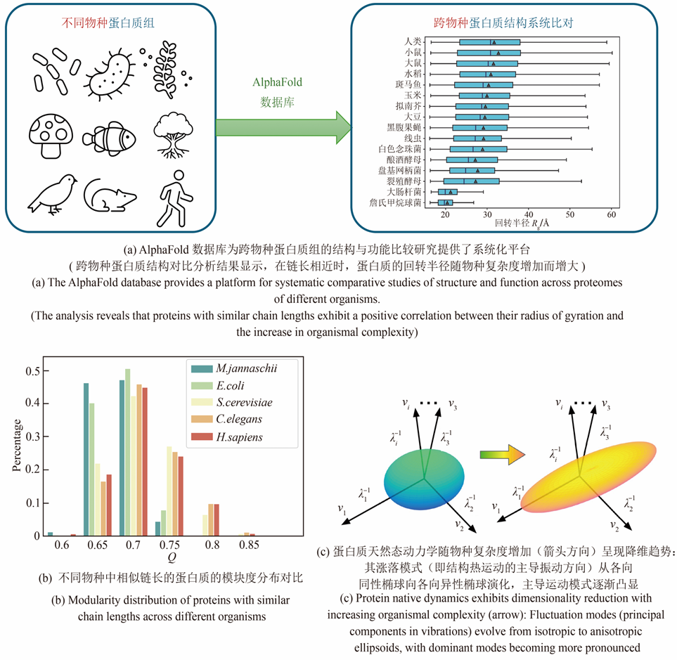 图5:基于AlphaFold数据库研究不同复杂度物种体内蛋白质结构与动力学的统计规律(详情请见集智俱乐部公众号文章《<合成生物学>期刊 | 唐乾元等:统计物理与人工智能驱动的蛋白质结构生物信息学》)