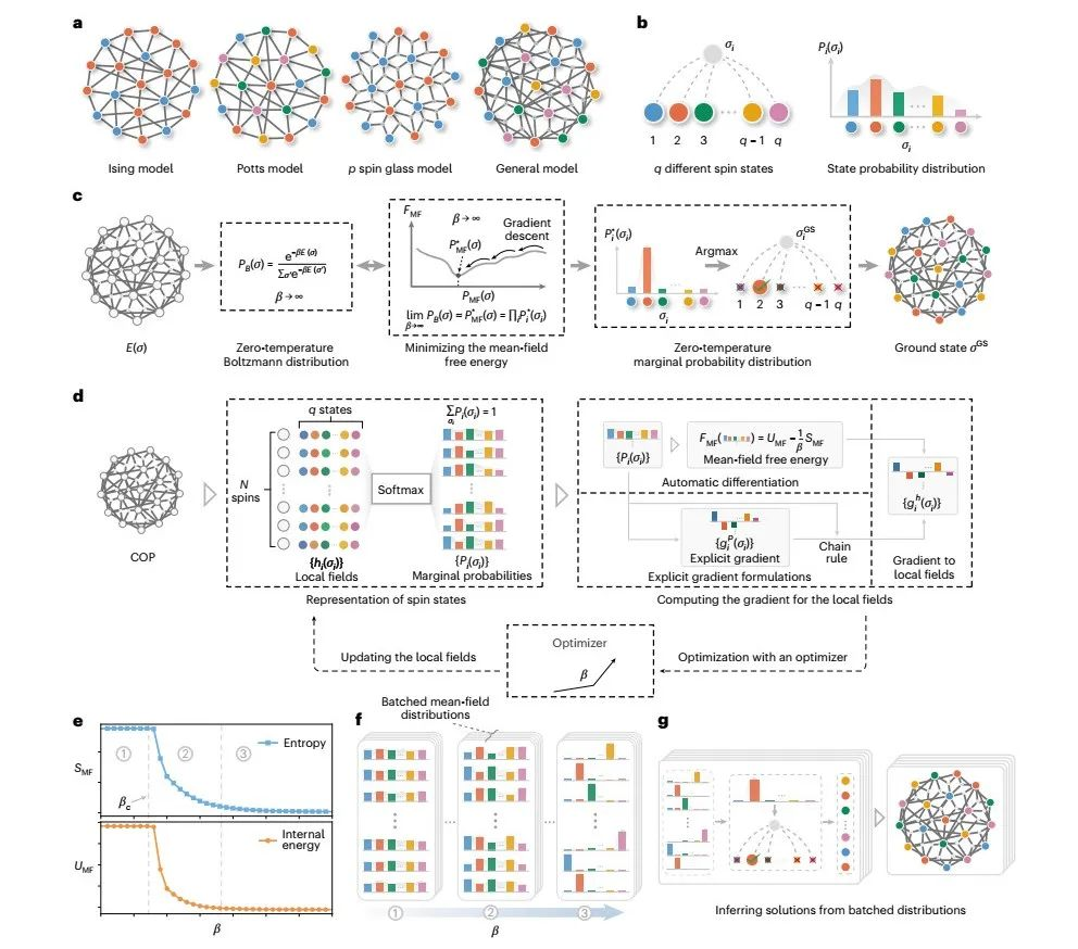 图6:FEM解决组合优化问题(COPs)的原理与框架(详情请见集智俱乐部公众号文章《Nature计算科学最新:统计物理x机器学习用于求解组合优化问题》)