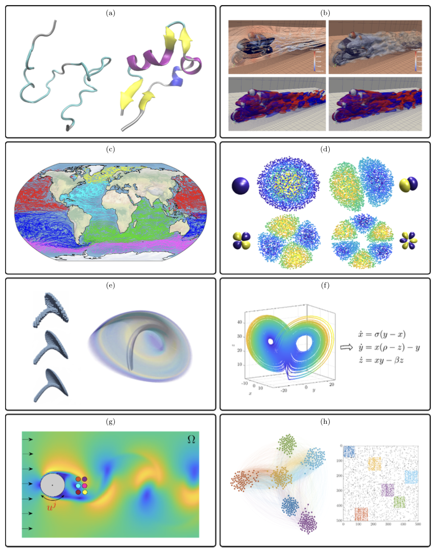 这种“以线性把握非线性”的策略在复杂系统研究中反复出现。以Koopman 算子理论为代表,线性代数被系统性地用于“线性化”非线性动力学系统。Koopman 算子本质上是作用在观测函数空间上的无限维线性算子,其谱结构编码了系统的全局动力学信息。通过对该算子进行谱分解,研究者能够识别系统中的慢模态、亚稳态结构以及主导时间尺度,从而在不依赖精确动力学方程的前提下,直接从数据中提取系统的内在组织方式。这一方法已广泛应用于分子动力学、流体力学、气候系统以及复杂网络等领域,并在非线性强、维度高、模型不完全已知的情形下展现出独特优势。