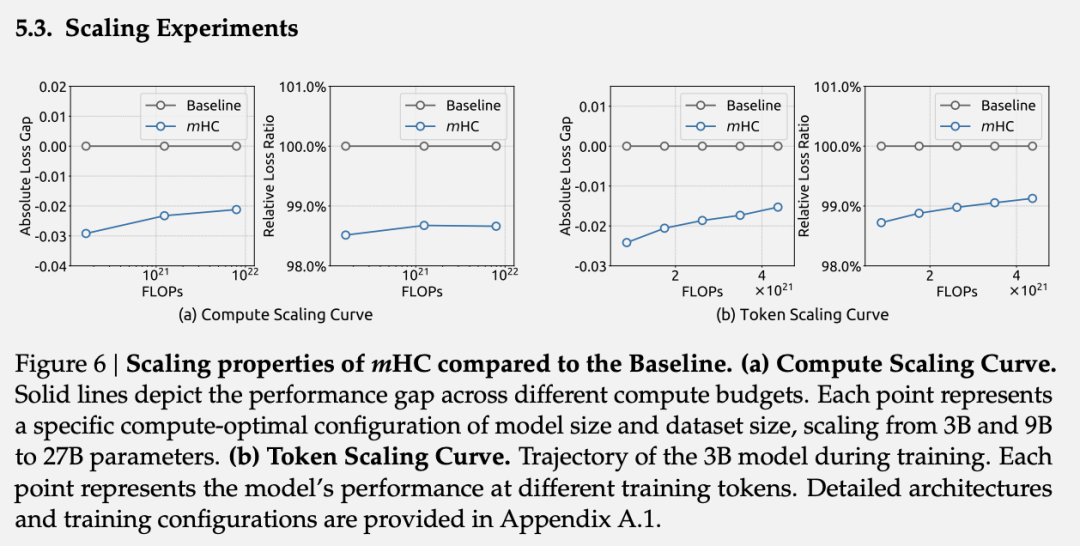 计算缩放曲线显示,mHC的性能优势在更高计算预算下仍然保持,仅出现轻微衰减。对3B模型的token缩放曲线分析表明,mHC的优势贯穿整个训练过程。