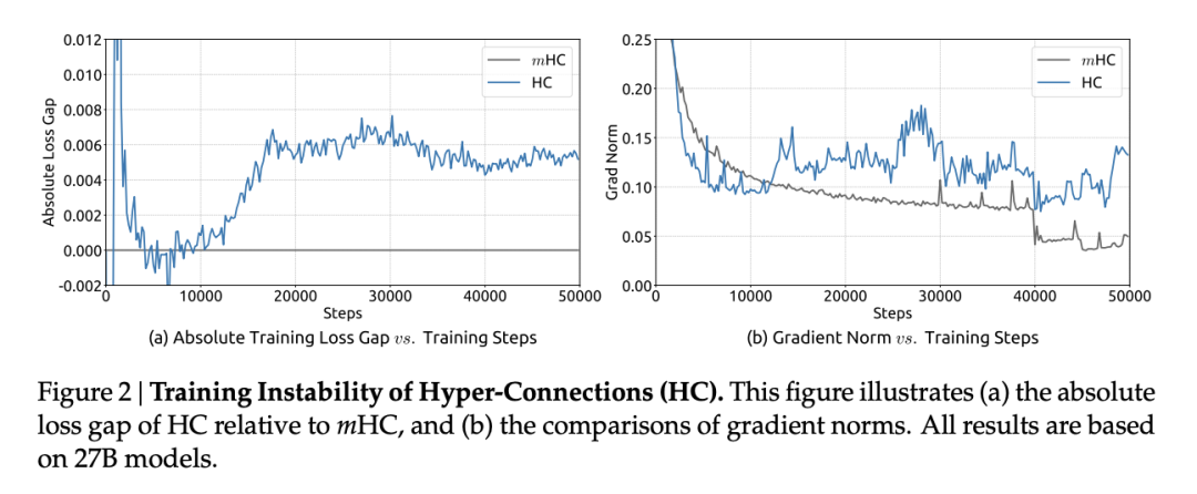 论文中展示的27B模型训练曲线显示,HC在约12000步时出现了突发的损失激增,梯度范数也表现出剧烈波动。