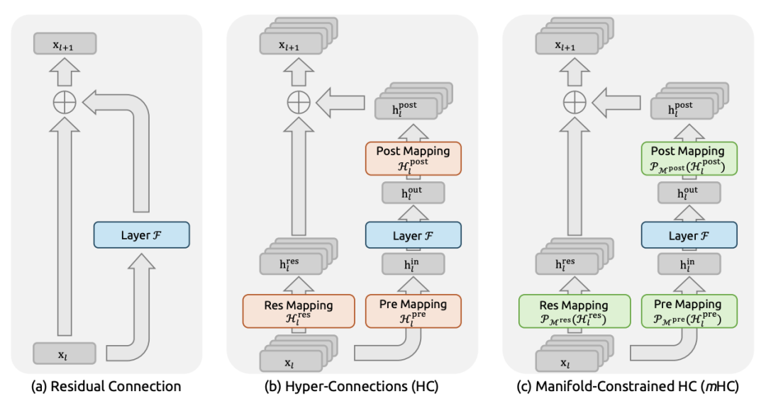 近期出现的Hyper-Connections(HC)试图打破这一格局。HC将残差流的宽度从C维扩展到n×C维,并引入三个可学习的映射矩阵来管理信息流动。