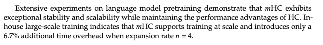 论文提到,内部的大规模训练实验进一步证实了这些结论,且当扩展率n=4时,mHC仅引入6.7%的额外时间开销。