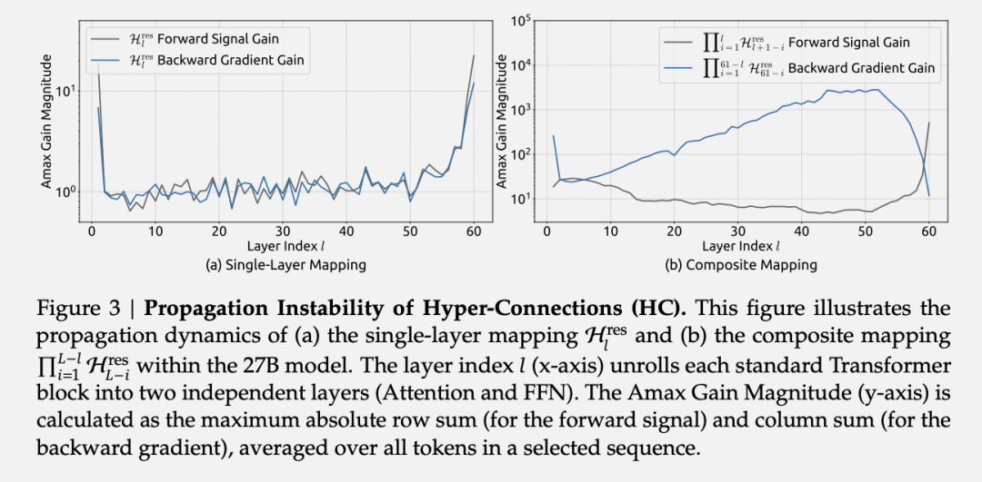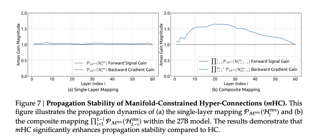 实验数据显示,这个近似解已经足够有效:在27B模型中,mHC的复合映射信号增益最大值约为1.6,与HC的3000形成了三个数量级的差距。
