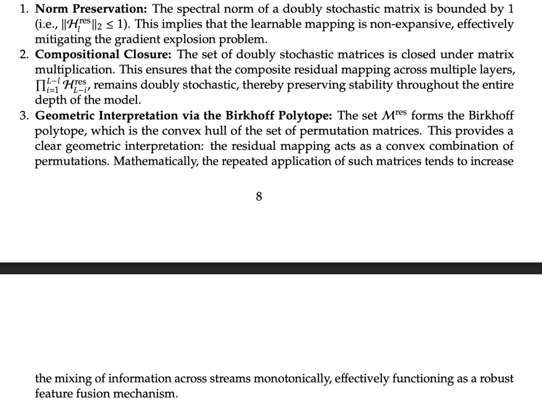 第二是组合封闭:多个双随机矩阵相乘的结果仍然是双随机矩阵,因此无论网络多深,跨层的复合映射都能保持稳定性。