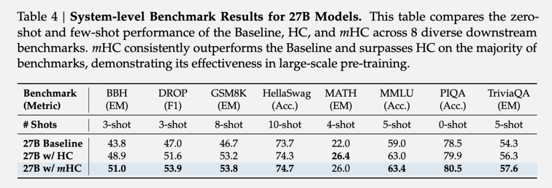 在下游任务评测中,mHC在BBH推理任务上比HC提升2.1%,在DROP阅读理解任务上提升2.3%。mHC在大多数任务上不仅超过基线,还超过了HC。