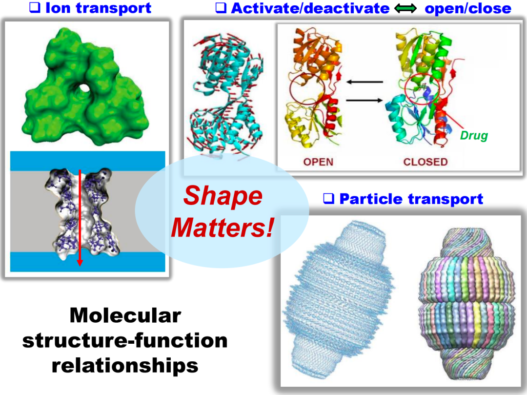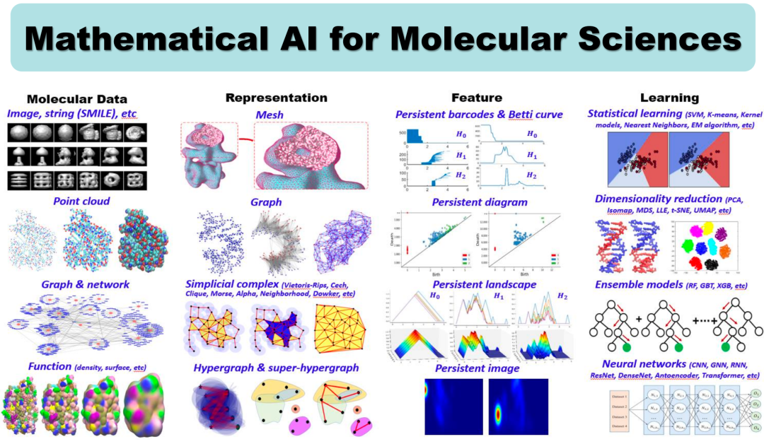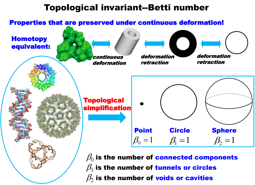 Chazal, Frédéric, and Bertrand Michel. "An introduction to topological data analysis: fundamental and practical aspects for data scientists." Frontiers in artificial intelligence 4 (2021): 108.在处理图像数据时,我们可以借助神经网络模型生成相应的数据表示。例如通过提取特定的特征点构建网格模型进行人脸识别。除了网格模型,还有其他如特征图和热度图等不同的数据表示方式。虽然源自同一图像数据,但从数学角度可以建立起不同的模型:最简单的矩阵模型,或者点阵模型、网格模型,甚至更复杂的函数模型。一旦数学模型建立,就可以基于模型提取特征,并与后续关注的信息产生联系,如通过多层感知器(MLP)进行预测等。类似地,在处理分子数据(如小分子数据和蛋白质数据)时,也有多种不同的数据表示方式。一种常见方法是基于共价键的图表征,其中每个节点代表一个原子,边代表共价键,形成一种图的表示形式。除此之外,还有几何方法,例如将原子看作半径固定的球体,观察者可以从球体集合的外部,即分子的表面进行研究,查看其表面积或凸凹区域。这些凸凹区域与原子间的相互作用信息有关,这种描述更偏向几何。更进一步,还可以通过密度泛函理论来计算电子密度或电子函数分布,将分子数据转化为一种空间形态的数据表现形式。因此,尽管源自同样的分子数据,我们可以从多个角度对其进行表征。一旦完成表征,就可以在此基础上提取各种特性,包括各种指纹(fingerprint)和描述符(descriptor)等等。这些性质可能和最终想要理解的功能产生联系,例如水溶性、脂溶性、毒性等。在构建关于分子功能模型的过程中,大量使用了结构数据。这是因为分子的结构和其功能之间存在强烈的关系,被称为“结构-功能关系”(Structure-Function Relationship)。例如,离子通道蛋白质的显著特点是它们中心有一个洞(图4左上),这个洞对离子通道的功能至关重要,因为它方便了细胞膜外部的离子进入膜内,或者膜内的离子离开细胞。另一个例子是蛋白质笼(图4右下),这种蛋白质的表面有一定结构,但其内部是空的,就像用来装东西的盒子,这种空心的结构有利于某些物质的存储和运输。最后一个例子是具有两个固定区域,并通过一个灵活连接区域相连的分子。这种结构可以形成一种开关状态,使得分子能够处于激发态或非激发态,从而影响其功能。无论是通过共价键连接还是通过非共价键的相互作用,都会影响最终的稳定态结构,这种稳定态结构与分子功能紧密相关。因此,描述分子的结构对于理解分子功能具有重要作用。为更好地描绘分子的结构,大量的描述符(无论是组合量,代数量还是几何量)被提取了出来。在这些描述符中,有一些关注拓扑特性,比如图上向量、几何量等等,还有一些关注组合或邻近信息的指纹。在大量关于结构的描述量中,可能存在某些更本质、更全局的量,它们能够更好地抓住结构的整体信息,从而在理解和描绘分子的功能方面起到更重要的作用。这就引出了拓扑数据处理的核心:通过拓扑不变量来描述数据。拓扑数据分析与传统的工具相比有三个主要特征:
