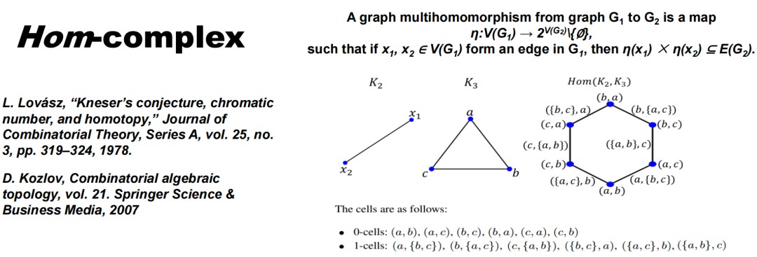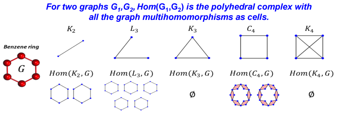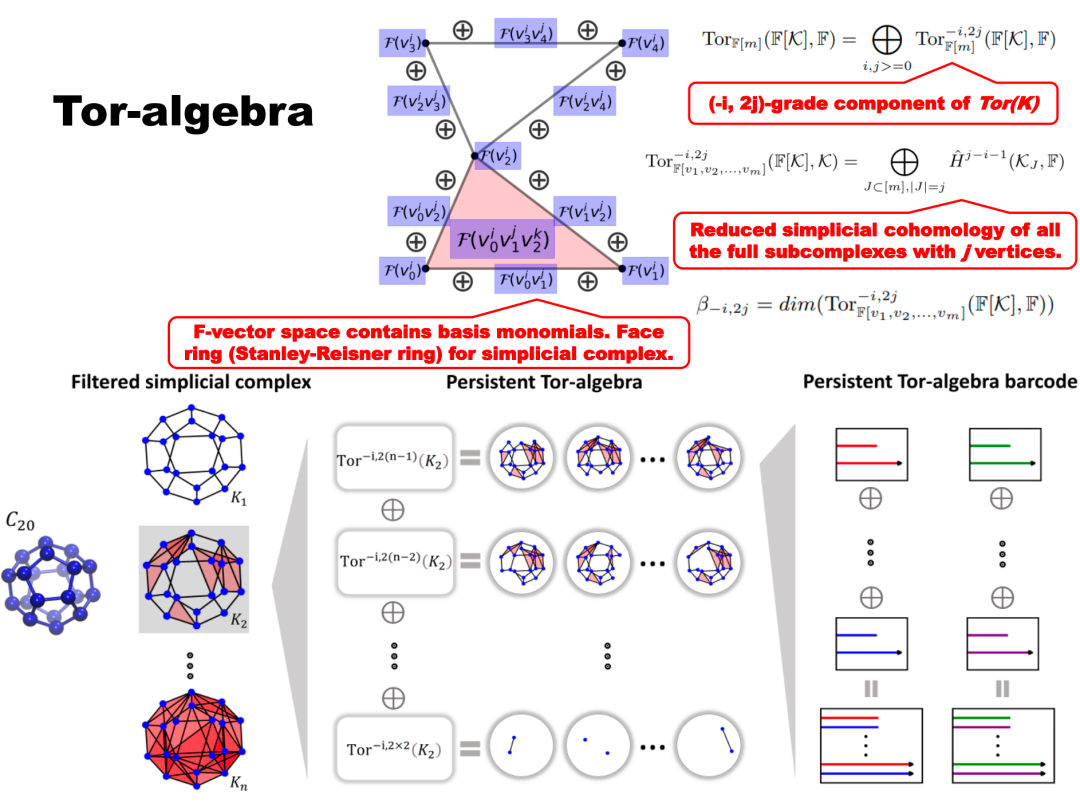 更复杂的场景可以用“Hom Complex”构造方式,这种方法适用于研究两个图的相互作用。其核心是构建一个称为Polyhedral Complex 的结构,其中元素为多重同态(Multihomomorphisms)。举个例子,假设有两个图 K2 和 K3,选择某种映射策略将 K2 映射到 K3 。这个映射只需保证:原图存在的边,映射到新图中也存在对应边。比如将 K2 的点 K1 映射到 K2 中的点 a,点 x2 映射到点 b。但如果尝试将点 K1 和 x2 都映射到点a,那就会出现问题,因为在原图中点 x1 和 x2 之间存在边,但在新图中,点 a 无法形成自环。如上图所示,将 x2, x2分别映到单点集的映射构成零单形 0-cell,将其中一点映到二点集的映射构成了一单形 1-cell,所有这些映射 η 构成了复形 Hom(K2, K3)。当考虑更复杂的连接关系时,比如使用高阶或卷积核样式的关系进行映射,这种方法能够帮助生成新的单纯复形,进一步反映图在这种特定内核下的深层联系。我们还能将单纯复形的结构提升到更复杂的代数结构进行考虑。比如,给定一个单纯复形,定义一组多项式,并在这些多项式之间建立特定的关系(例如Stanley-Reisner理论),进而得到一个理想(ideal)的结构,然后研究这个理想的性质,例如它的Tor函子等。这样,图的拓扑信息就被转换为了代数量,单纯复形上升到代数层面,在这个层面上进行研究。Xiang, L. I. U., and Kelin Xia. "Persistent Tor-algebra based stacking ensemble learning (PTA-SEL) for protein-protein binding affinity prediction." ICLR 2022 Workshop on Geometrical and Topological Representation Learning. 2022.Persistent Tor-algebra(PTA)为生物学研究提供了一种强大且有效的新工具