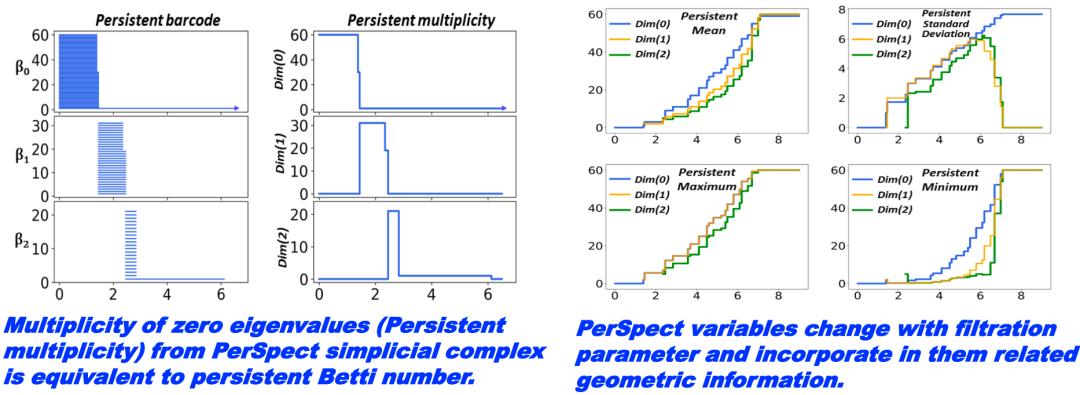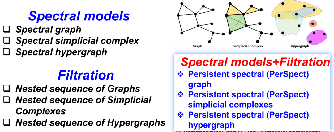 3.3 Persistent Spectral:谱图法结合过滤流过程在观察和分析数据时,主要有两种方式:一是考虑数据的表征(representation),二是利用数据的特性(features)。前面讨论我们主要关注拓扑的特性,包括各种拓扑不变量,它们描述了结构的复杂性。另一方面,当我们想保留数据的更精细的特征,就需要考虑数据的其他数学不变量。例如,针对图或单纯复形,我们可以考虑谱图方法以及它的扩展,这种方法基于图、单纯复形或超图上的离散拉普拉斯算子(Hodge Laplacian),并用其谱的信息进行数据表示。为将这两种思路相结合,我们提出一种新的模型 Persistent Spectral。这个模型综合利用了过滤流过程和谱图方法,在保留数据原始形态的同时,还能揭示其内在的拓扑特性。Edelsbrunner, Herbert, and John Harer. "Persistent Homology-a Survey." Contemporary mathematics 453.26 (2008): 257-82.