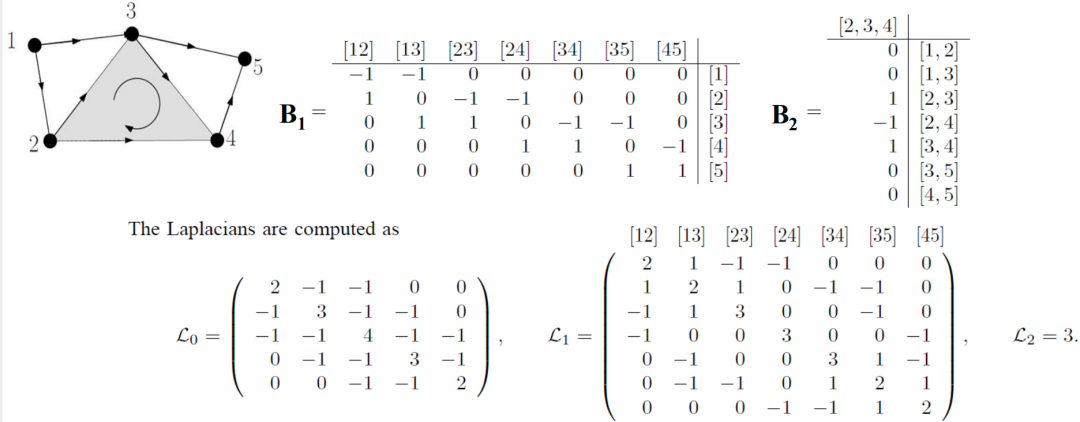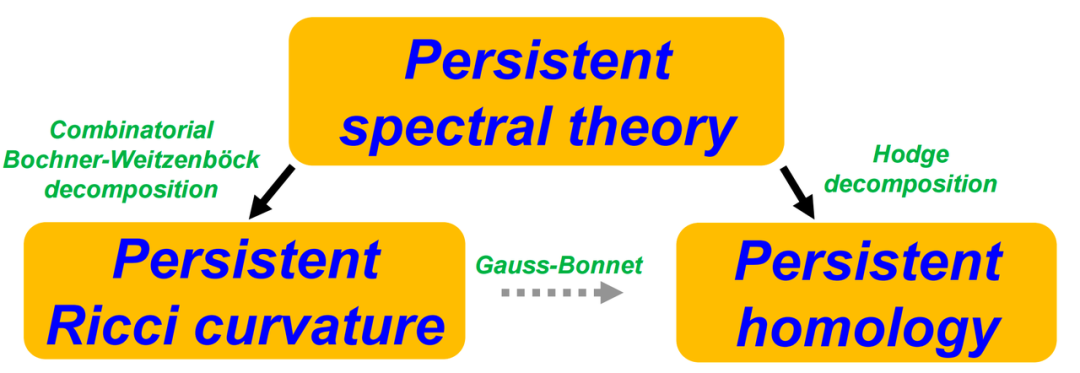 拉普拉斯矩阵的概念我们只做大致介绍,k 维拉普拉斯矩阵 Lk 有如下计算公式举个例子,0维拉普拉斯矩阵 L0 以点为单位对象,对角线为点的度数,当点 i 和 j 连接时 L0 的 (i, j) 位置取 -1 否则取0。类似地,在复形上,将边作成单位对象,由边的关系得到 1 维拉普拉斯矩阵 L1 。将得到拉普拉斯矩阵进行特征值分解,其中零特征值的数目对应了 Betti0,其反映图的连通分量的数量。拉普拉斯矩阵的非零特征值也包含有丰富的信息。比如最小的非零特征值,也被称为 Fiedler 值,常用来刻画图的连通性,展示单纯复形各部分之间的连接关系。另外一个重要的不变量是几何不变量,例如 Ricci 曲率。Ricci 曲率能够捕获图或网络中的社区结构或簇(cluster)结构。举个例子,当图中有一个紧密连接的社区或聚类时,这个区域的 Ricci 曲率通常是一个较大的正值。而连接两个不同社区或聚类的桥梁部分,Ricci 曲率则可能为负值。因此,许多研究者利用 Ricci 曲率的赋值方法来描述网络中各区域之间的相互连接性。Ricci 曲率及其它各种曲率都是用来描述整体结构、簇结构、社区结构以及链接结构间关系的重要工具,能用于揭示网络或数据集内部丰富复杂的拓扑和几何属性。实际上,上边提到的信息可以相互关联起来。比如,拓扑学中的 Betti 数(homology信息)和Hodge Laplacian中的零特征值是一一对应的。离散形式的 Ricci 曲率(例如Forman Ricci curvature)也可以通过与Hodge Laplacian的某种组合(比如Bochner-Weitzenböck公式)来产生联系。使用这些工具从不同角度描述数据的结构: