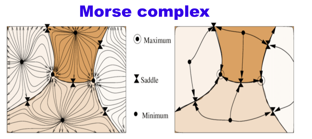 3)过滤流过程:拓扑数据分析包含一个过滤流过程,这个过滤流过程可以与系统内的多尺度描述很好地结合。通过从不同的尺度去观察和分析数据,我们能够得到更全面的信息。在非数学领域,如计算机科学、工程和生物学中,人们通常使用图来表达实体之间的连接关系。然而,在基础数学领域中,更经常使用的是称为单纯复形(Simplicial Complex)的描述方式。作为高级的拓扑工具,单纯复形能更好地描绘复杂系统中的结构信息。1)高维度描绘:除表示节点和边(即0维和1维的对象),单纯复形可以表示更高维度的对象。例如,填充的三角形代表一个2维的对象,填充的四面体代表3维对象。2)高阶相互作用:图主要描述两两之间的相互作用,而通过引入“更高维度的单元”,单纯复形能够表达出超过两个实体之间的相互作用。例如,填充的三角形表示三个实体之间的相互作用,填充的四面体表示四个实体之间的相互作用。注意二者的区别,用一个形象的比喻来解释:图可以表示父亲与孩子的关系,以及母亲与孩子的关系;而复形则能表示父亲、母亲、孩子三者组成的家庭单位的关系,用一个填充的二维三角形。3)距离和体积的描述:图通常只能描述路径或距离,单纯复形则可以描述面积,两边夹角(2维单元)或者体积(3维单元)。这为我们提供了更高阶的信息,使我们能够捕获到实体间更复杂的相互作用。举个简单的例子,从一组点和固定距离构造一个复形(Vietoris-Rips复形):或者复杂些,在微分拓扑中,根据函数导数取值0的信息及其正定性将流形分片(Morse复形):Magillo, Paola, et al. "A discrete approach to compute terrain morphology." Computer Vision and Computer Graphics. Theory and Applications: International Conference VISIGRAPP 2007, Barcelona, Spain, March 8-11, 2007. Revised Selected Papers. Springer Berlin Heidelberg, 2008.