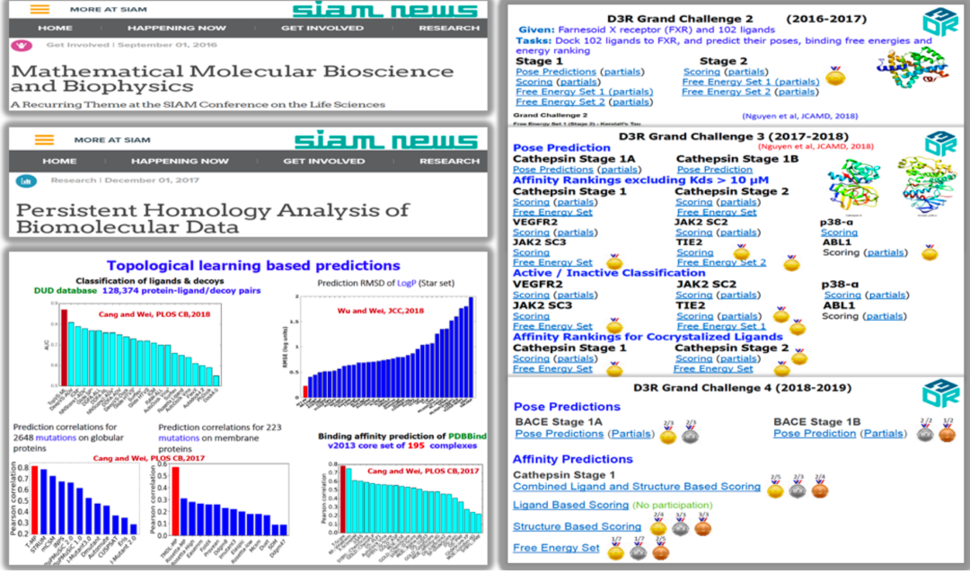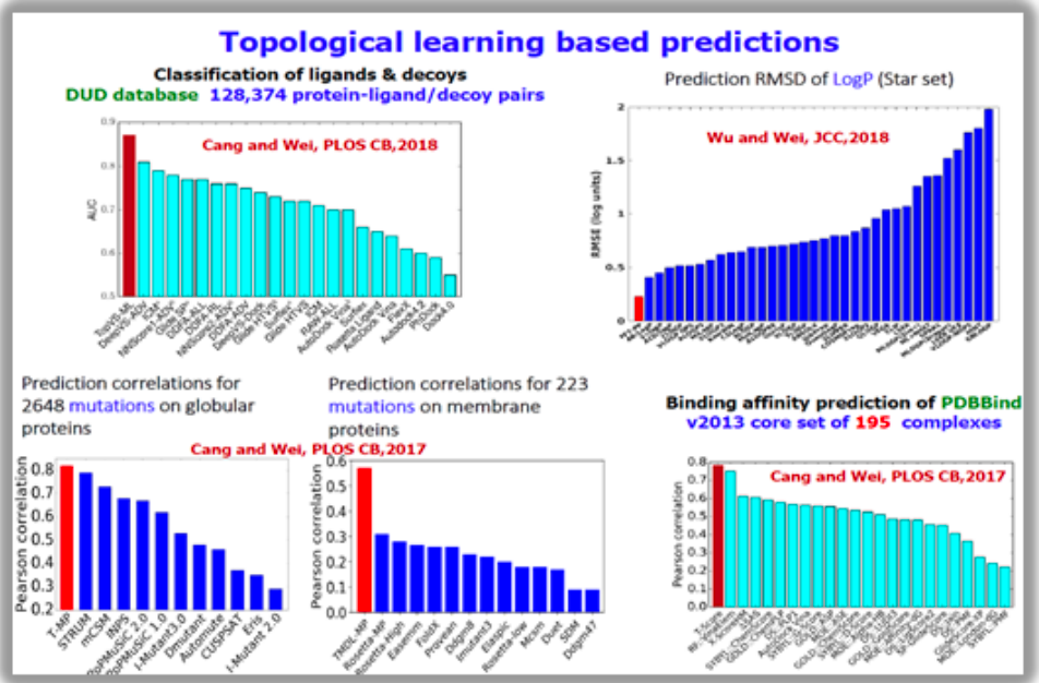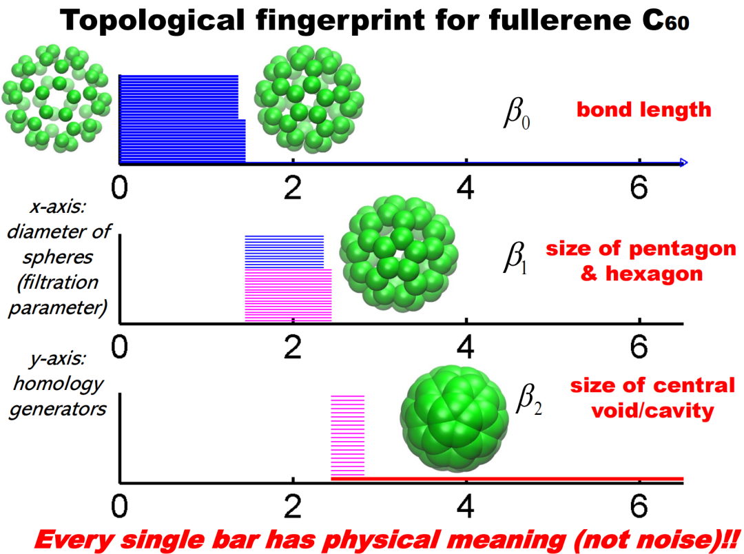前边更多是从数学角度出发的讨论,在处理真实世界的问题时,我们该如何将拓扑理论应用到化学分子等具体科学问题上?以碳60分子为例,C60 是由 60 个碳原子组成的分子,其形状类似于足球,包含了 12 个五元环和 20 个六元环。如下图所示,我们用拓扑数据分析进行分析,X 轴表示直径。图14. C60 分子模型随直径变化的 Betti 数 • 在 Betti-0 中,有 60个条形码,其中 30 个较短,30 个较长。较短的代表碳碳双键,因为双键较强,原子拉得近;而较长的则代表碳碳单键,比双键要弱,因此距离稍长。这样,Betti-0 描述的是共价键的信息。 • 在 Betti-1 中,有 32 个条形码,其中 12 个较短,20 个较长。较短的对应五元环,而较长的则对应六元环。所以,Betti-1 描述的是环的信息。 • 在 Betti-2 中,可以看到一个长条形码,这个对应 C60 分子整体的空心结构。通过这些特征信息,我们将拓扑数据分析与机器学习相结合。例如在数据上构建不同类型的单纯复形,进行过滤流过程,得到条形码,然后提取各种特征(如最长的条形码、最短的条形码、总的数量等),并将这些特征输入到机器学习模型,如 Random Forest 或 Gradient Boosting Tree 等,进行功能预测等任务。这样就实现了拓扑深度学习的基本流程。在拓扑数据分析(TDA)与机器学习相结合的研究领域中,魏国卫教授和他的团队做了大量的创新性工作。他们通过 TDA 提取数据集的特征,并将这些特征用于各种预测任务。在过去的几年里,在图网络并未广泛应用、且可处理数据量相对较小(通常在三千到四千之间)的时代,他们的研究成果表明 TDA 能提取出比传统统计方法或某些特定组合更有效的特征。从多个benchmark数据集的结果来看,他们的基于 TDA 的模型表现非常好。尤其值得注意的是,他们在 D3R 药物设计比赛中,通过结合TDA和机器学习的方法,在2017和2018两届比赛中都取得了显著的优势,并超越了许多传统的方法。他们在TDA和机器学习结合的研究方向上的早期工作,为该领域奠定了坚实的基础。Cang, Zixuan, Lin Mu, and Guo-Wei Wei. "Representability of algebraic topology for biomolecules in machine learning based scoring and virtual screening." PLoS computational biology 14.1 (2018): e1005929.