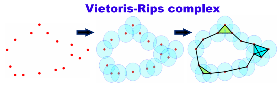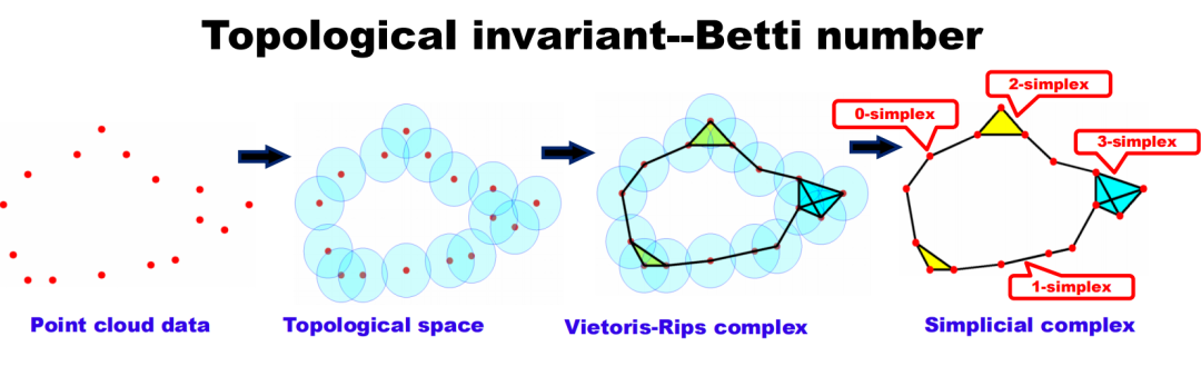 拓扑不变量是对拓扑空间性质的一种刻画,在数据分析中提供了全局和本质的视角。相较于如 PCA 这样的统计方法,它更关注整体的性质。举两个经典的拓扑不变量例子:1)欧拉示性数:欧拉示性数取值为“顶点数 减去 边数 加上 面数”(V-E+F)。对于拓扑等价于球体的多面体(例如立方体或八面体等),欧拉示性数均为2。这是因为在拓扑意义上,这些形状都可以被连续地变形为球形。2)贝蒂数:贝蒂数是在拓扑数据分析(TDA)中常用的拓扑不变量,用来描述拓扑空间的复杂度。零维的贝蒂数表示连通分支的数量,一维贝蒂数表示独立环路的数量,二维贝蒂数表示“空心”球面的数量,等等。过滤流过程(filtration)是拓扑数据分析的核心概念。这个过程可以理解为不断改变尺度以观察复杂系统如何随着尺度的变化而变化。过滤流过程在不同的尺度上描述单纯复形,并且生成相应的条形码来记录每个尺度下的拓扑信息。上图最左边的十四个点代表原始数据,每点周围有一个球体,随时间推移,这些球体的半径增大。当两个球体接触时,表示两个数据点之间存在连接,这就形成了一条边,同时独立分支的数量减一。在过滤流过程中,随着球体半径的增大,独立元素逐渐减少,同时出现新的拓扑结构(比如环和更高维的洞)。从图中的条形码可以看出,初始有14个独立节点,所以 Betti0 为 14 个。随着时间的推移,球体之间的连接增多,独立的节点数目减少。同时,当出现闭合的路径时,就形成了环,可以在 Betti1 的条形码中看到这种变化。图12. Vietoris-Rips 复形与单纯复形通过过滤流过程和单纯复形,我们可以从全局和多尺度的角度理解复杂系统的结构,并通过 Betti 数这类拓扑不变量来量化这些性质。这种方法在机器学习、迁移学习等领域有着重要的应用,相比传统的统计工具,它提供了对数据深层本质结构的理解。