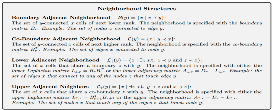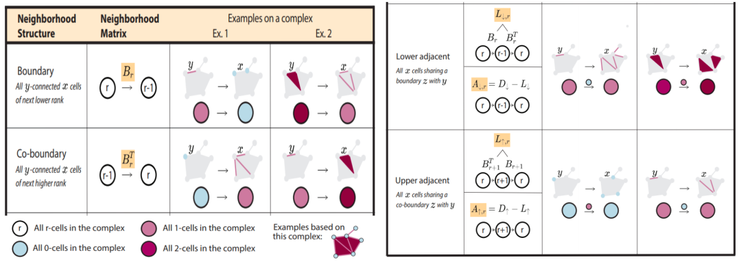 最后一部分,夏克林老师介绍了基于单纯复形的图神经网络,可以理解为图神经网络的一种扩展。在图神经网络中,核心的想法是通过消息传递(message passing)机制,将一个节点周围邻居的信息进行聚集,并传递到目标节点,然后通过迭代这个过程,实现对整个图结构的学习。在拓扑数据处理中,我们不再只是基于图来操作,而是在更高维度的单纯复形或者其它复杂结构(例如Stellar complex)上进行操作。例如,除了在点的层面上进行信息传递,我们也可以在边、面或更高维度的单纯形上进行类似的操作。在进行这种复杂的拓扑数据分析时,有两个非常核心的概念:边界运算(Boundary Operation)和余边界运算(Coboundary Operation)。简单来说,边界运算是指从给定的单纯形中找到其所有低一维的面。例如,从一个边(1-simplex)出发,我们可以找到它的两个端点(0-simplex)。而余边界运算则是反向操作,即从低维单纯形出发找高一维的单纯形。除此之外,还有两个重要关系:Lower Adjacency 和 Upper Adjacency。这两个关系都是描述图中的邻接关系,但方式各异。Lower Adjacency指的是当两条边有一个公共顶点时,我们称这两条边是邻接的。而Upper Adjacency则更为严格,只有当两条边共享一个高维单纯形(比如三角形)时,我们才认为它们是邻接的。通过考虑不同的连接方式,可以进一步描绘出数据中信息传递的不同路径,并通过将不同维度的信息耦合在一起,构建一个复杂的“拓扑神经网络”。这种结合了拓扑和深度学习的研究领域还相对较新,但已经被广大学者所关注,并有越来越多的研究工作开始尝试利用拓扑数据分析来提升深度学习模型的性能。Hajij, Mustafa, Kyle Istvan, and Ghada Zamzmi. "Cell complex neural networks." arXiv preprint arXiv:2010.00743 (2020).