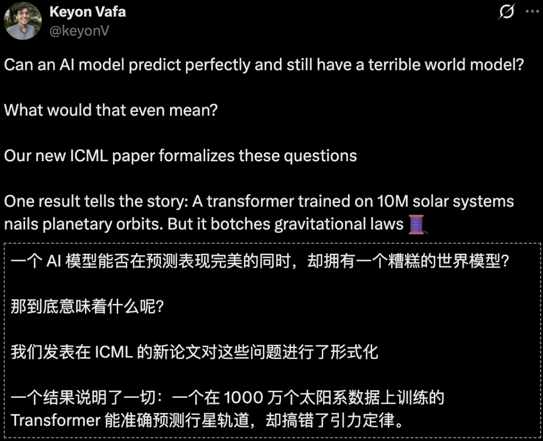 Keyon Vafa和合作者的研究表明,Transformer并不会自然地学出牛顿式的世界模型。