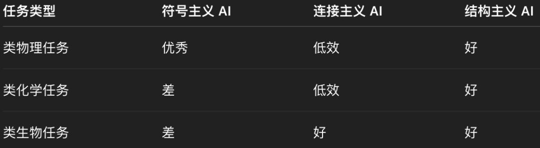 联结主义模型因其通用性,原则上可处理所有类型——但恰恰因其缺乏结构,在类物理与类化学问题上极其低效。