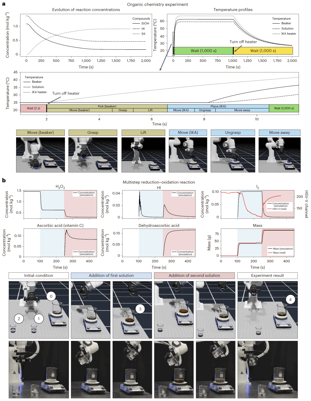 研究人员展示了有机反应与多步氧化还原反应的完整数字孪生模拟,涵盖样品转移、加热、反应执行和结果验证等环节。模拟结果在反应趋势和过程逻辑上与真实实验保持一致,为实验设计与验证提供了可靠虚拟环境。