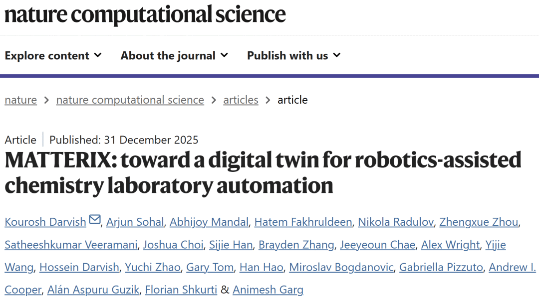 Darvish, K., Sohal, A., Mandal, A. et al. MATTERIX: toward a digital twin for robotics-assisted chemistry laboratory automation. Nat Comput Sci (2025).