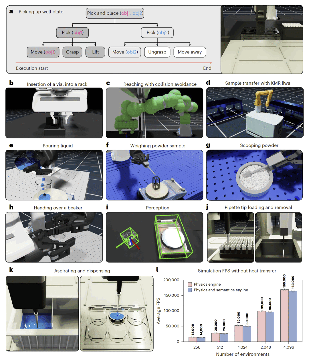 MATTERIX 内置可复用的操作与感知技能库,包括抓取、倒液、称量、粉体处理及多机器人协作。通过分层状态机,研究人员能够将底层操作组合为抽象技能,并进一步构建长时序实验流程。系统在 GPU 并行仿真下保持了较高的运行效率。