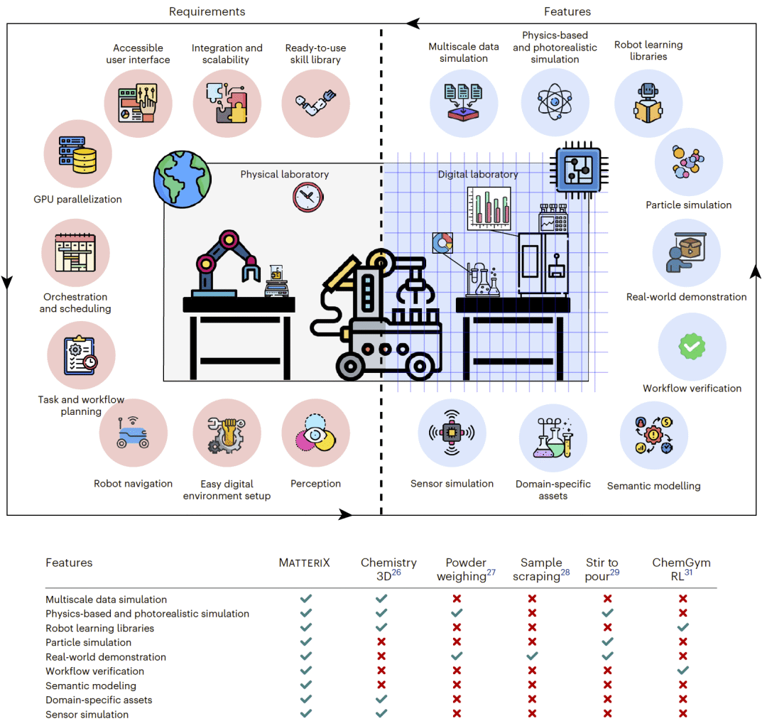 化学实验室的复杂性体现在多方面:多类型机器人协作、液体与粉体处理、设备功能逻辑、热与反应动力学耦合,以及高安全性要求。现有仿真工具往往只能覆盖其中的部分要素,缺乏一个统一的、多尺度的解决方案。MATTERIX 正是为填补这一空白而提出。