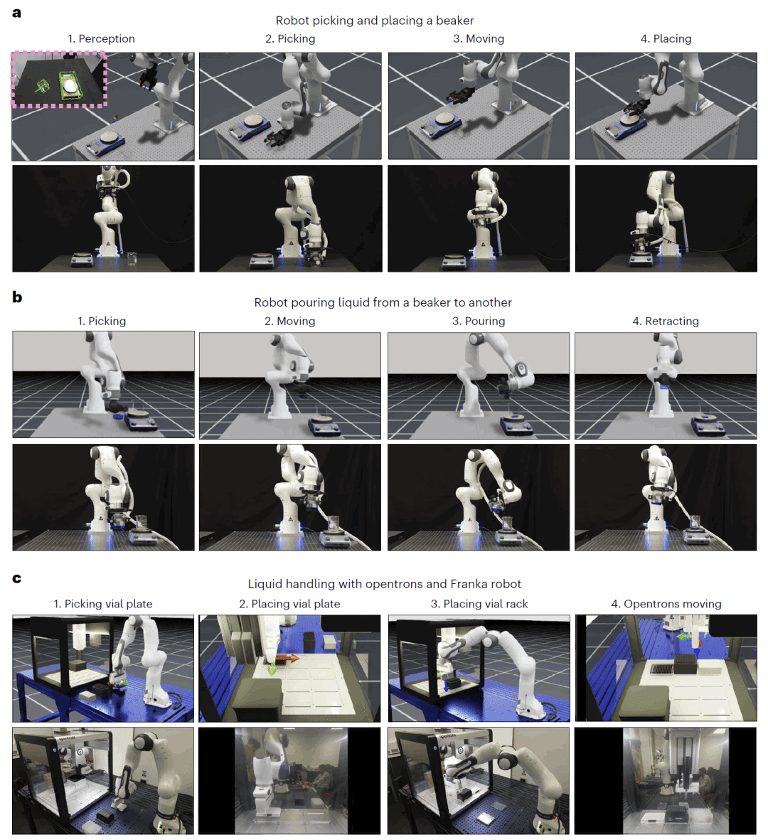 MATTERIX 支持将仿真中设计的工作流直接部署到真实实验室。研究人员在真实环境中验证了抓取放置、倒液操作以及机器人与自动化液体处理平台的协同工作,展示了较高的成功率和可重复性。